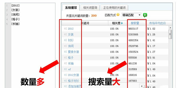 上图可以看到在添加关键词的时候,系统会推荐给我们很多这种广泛词,相关度都是100%,数量很多,同时搜索量非常大,说明这些词有非常多得人搜索,有搜索就有需求,有需求就有市场,买家不会无缘无故去搜索这些关键词,我们需要的就是抓住这部分需求,这么大的搜索量能给店铺宝贝带来很大的展现机会,提高曝光量。