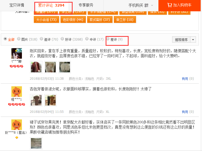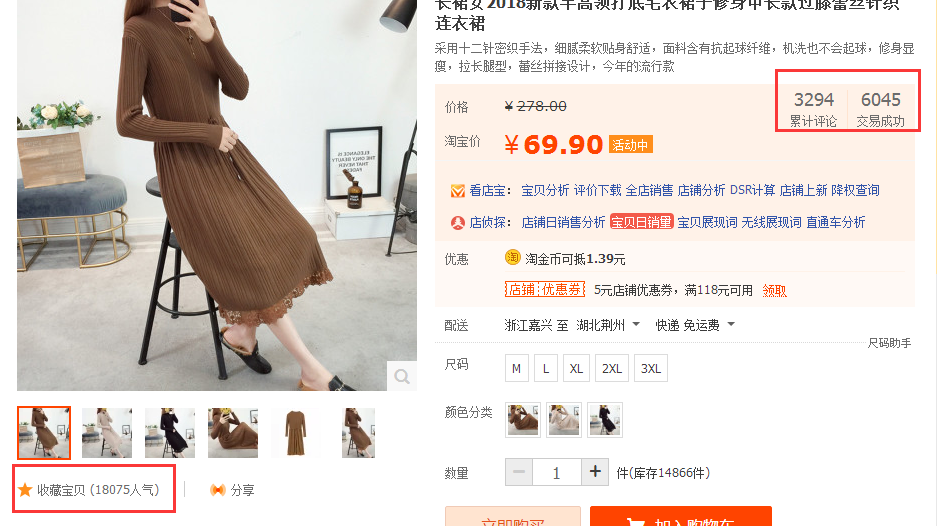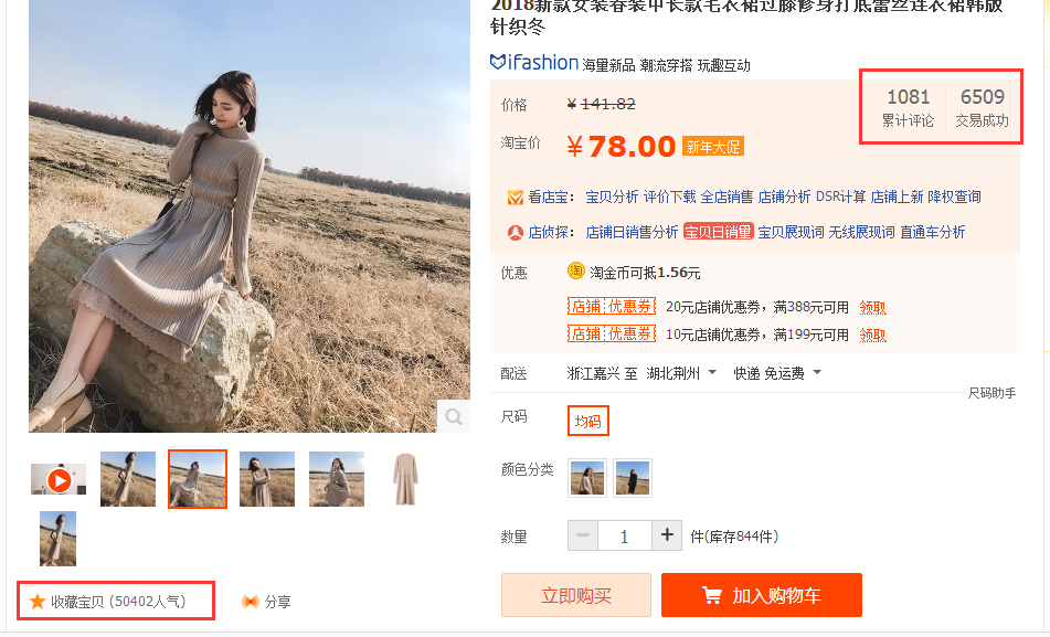 其次就是他的收藏人气,第二款宝贝收藏有5万,但第一款只有1万,对于我们一个爆款来说,收藏意味着潜在客户,特别是女装这一块。大部分的买家,都有先收藏后购买的习惯,所以说收藏人气是我们的一个重要的评判标准。最后我们来看一下差评这一块,这款宝贝有四个差评,一般宝贝有九个差评,但是因为他们累计评论的一个数量之间有差距,虽说最终算下来,实际上这个产品没有太大的一个差异化,那么中差评,就这两款宝贝来说,我们可以忽略。